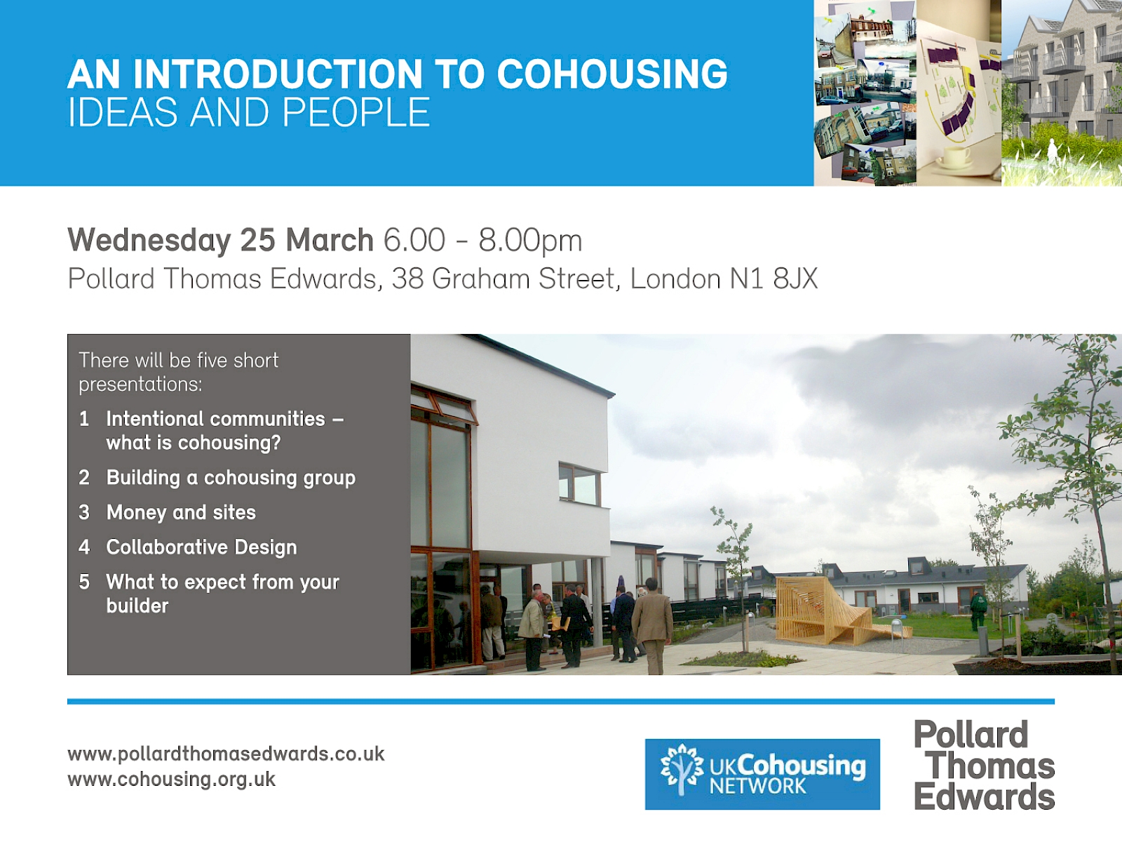 Pollard Thomas Edwards and UK Cohousing Network invite you to an evening event to hear from professionals in relevant disciplines with experience of cohousing, and to meet other interested individuals who are new to cohousing from your part of town.