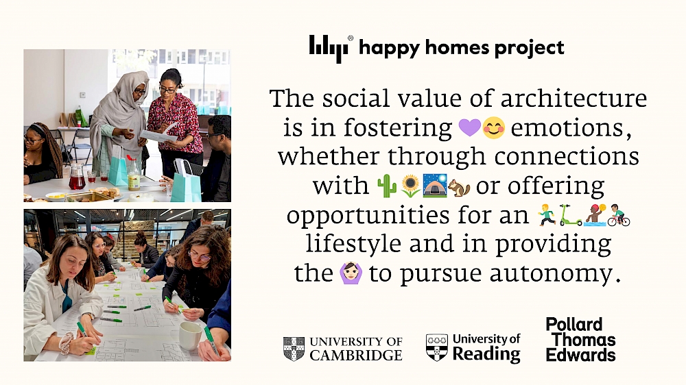 We regularly hear feedback from residents, but we recognised the need for a systematic way to identify and measure the aspects of housing design that support social value. This led us to establish the Happy Homes Project (HHP), a two‑year Knowledge Transfer Partnership with the University of Reading, Cambridge University, and researcher Dr. Gloria Vargas Palma. The project set out to quantify ‘embodied social value’ for the first time by asking residents what they value in their homes. It also captures insights from design teams, including clients, to assess how intentionally this value was built in.