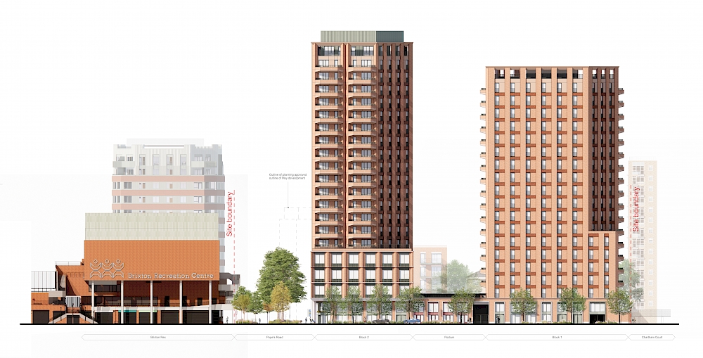 The design responds to Brixton’s urban grain with a series of four blocks that repair street frontages and create active, welcoming edges along Brixton Station Road, Pope’s Road and Canterbury Crescent. A robust, expressive material palette uses colour, texture and horizontal articulation to sit comfortably alongside the ‘Rec’ - Brixton Recreation Centre.