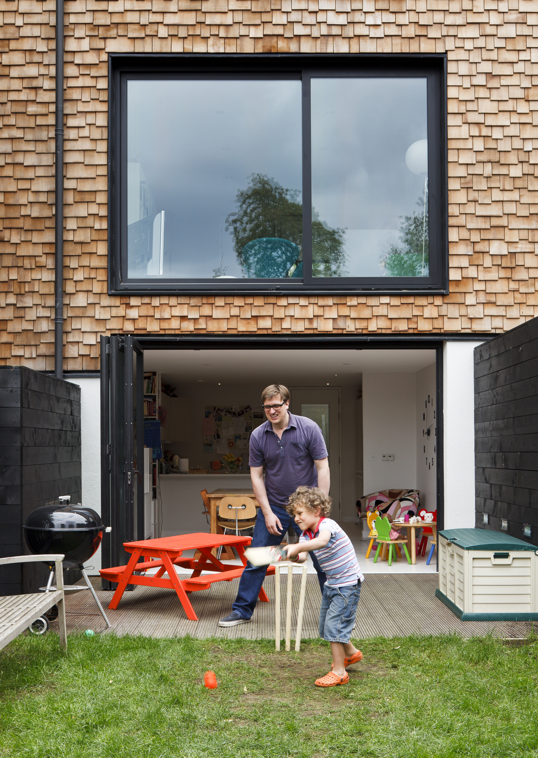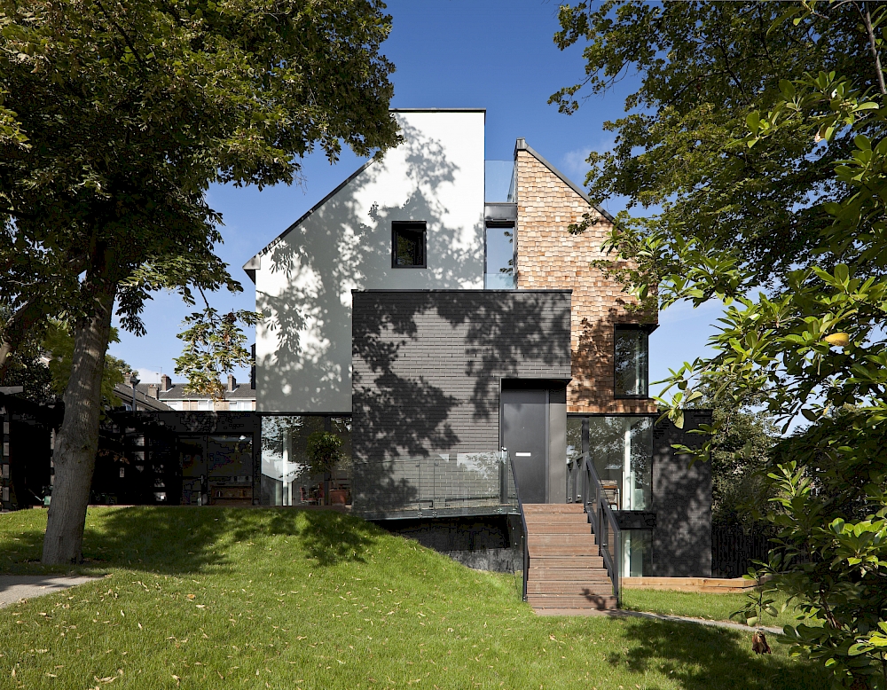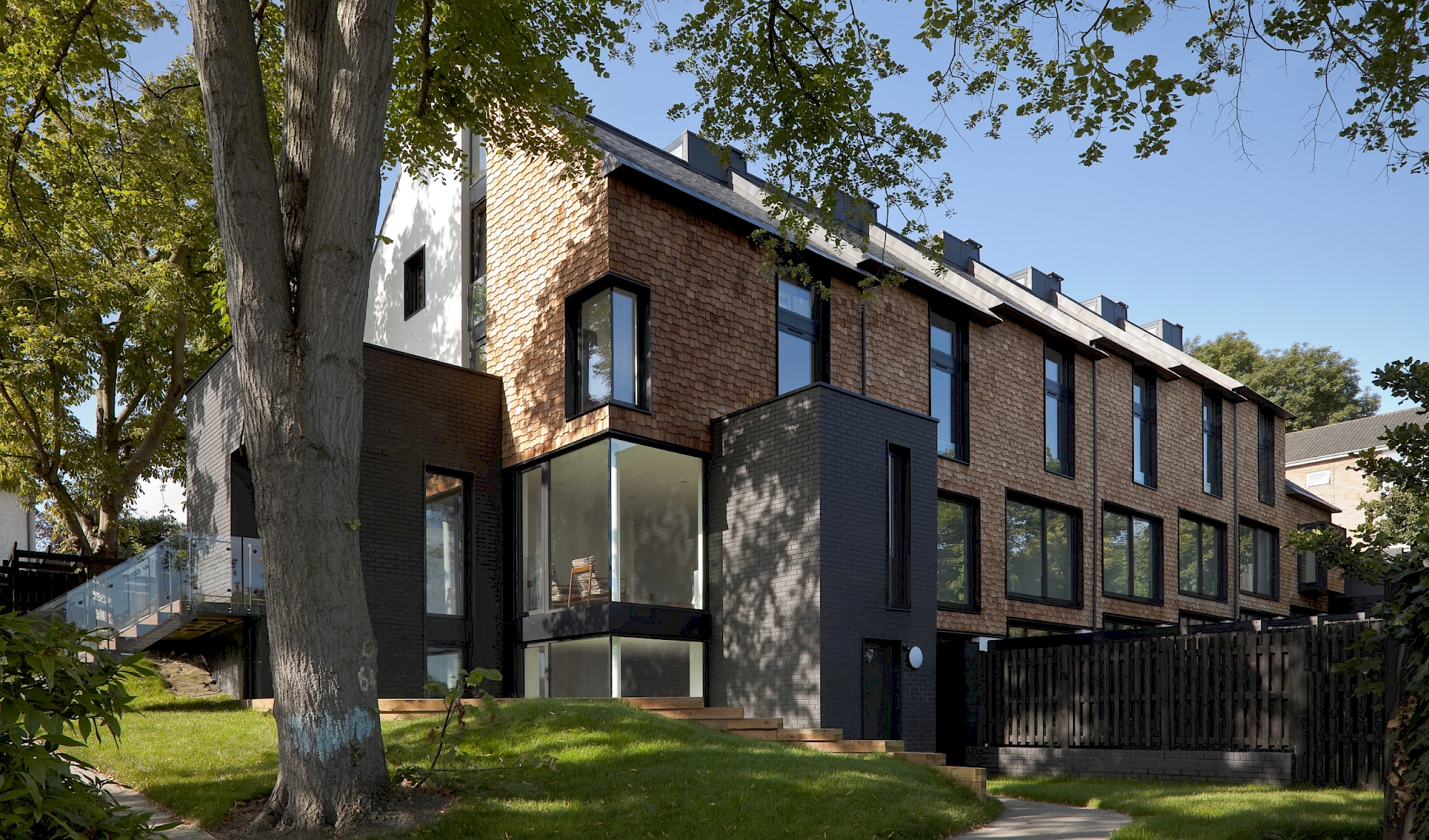 A tricky sloping site and a sensitive neighbourhood made this project a design challenge which had been taken up with relish. A series of terraced townhouses, culminating in a large family house for the architect of the project, has made excellent use of the site and provided architectural identity through use of timber shingles. Attention to detail, both external and internal, was clear; the design is both uncompromisingly contemporary, but on the other hand respectful of adjacent housing and the local vernacular.