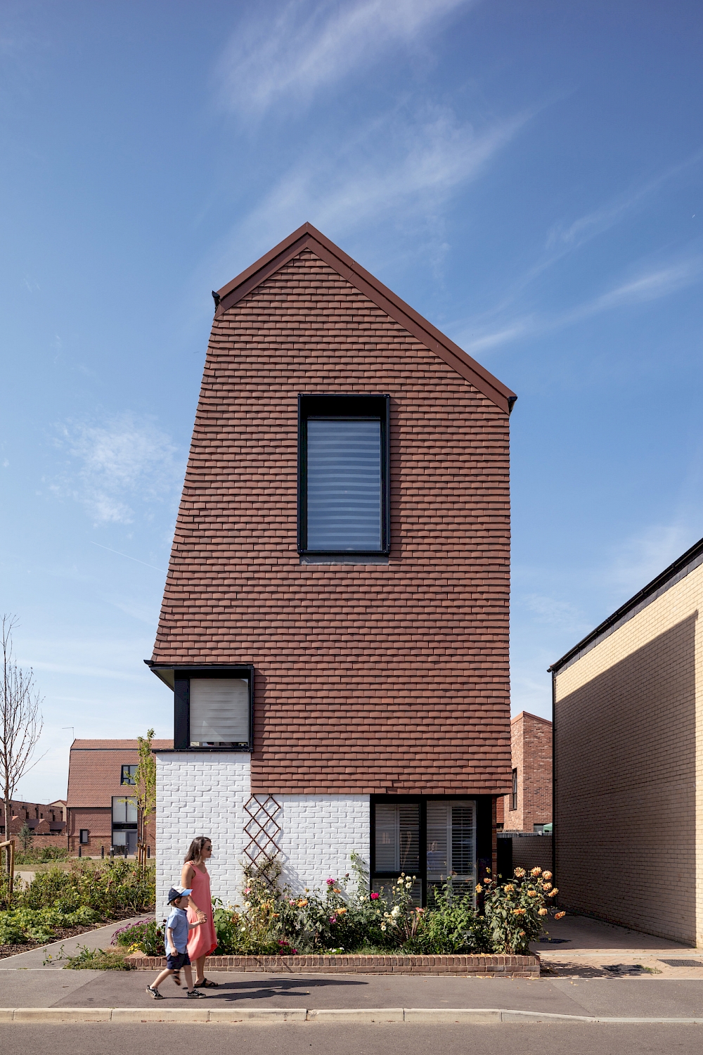 The 250-home community pays homage to the forms, materials, and local tradition of custom build, famously established by the postwar homes built by residents at nearby Dunton Plotlands. However, this project brings custom build into the 21st century through digital technology: homes co-designed by residents online and manufactured in a factory close to the site.