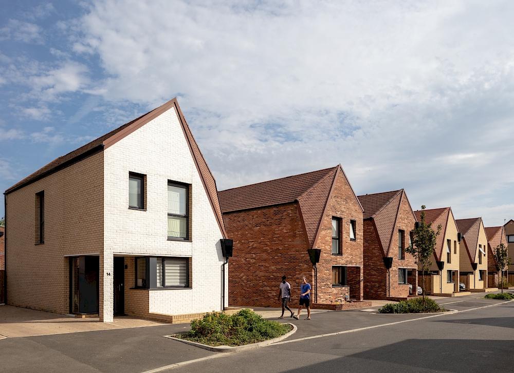 Here’s the jury’s summary of its recent visit to review the scheme: ‘Walking through the scheme, the jury was impressed by the genuine sense of place that had been created. Rather than the streetscape being dominated by cars, the parking requirement has been accommodated largely on-plot, prioritising views of the communal spaces. Street widths and housing typologies are varied and there is an interplay of housing, streets, and landscape, which creates areas of different character within the scheme. Across the centre of the development is a series of ‘linked greens’ which provide communal amenity space for residents and create a wildlife corridor between neighbouring parks. As a whole, the scheme creates a convincing, contemporary neighbourhood which, by employing innovative design and construction methodologies, has delivered a sense of agency, quality and variety for its residents.’