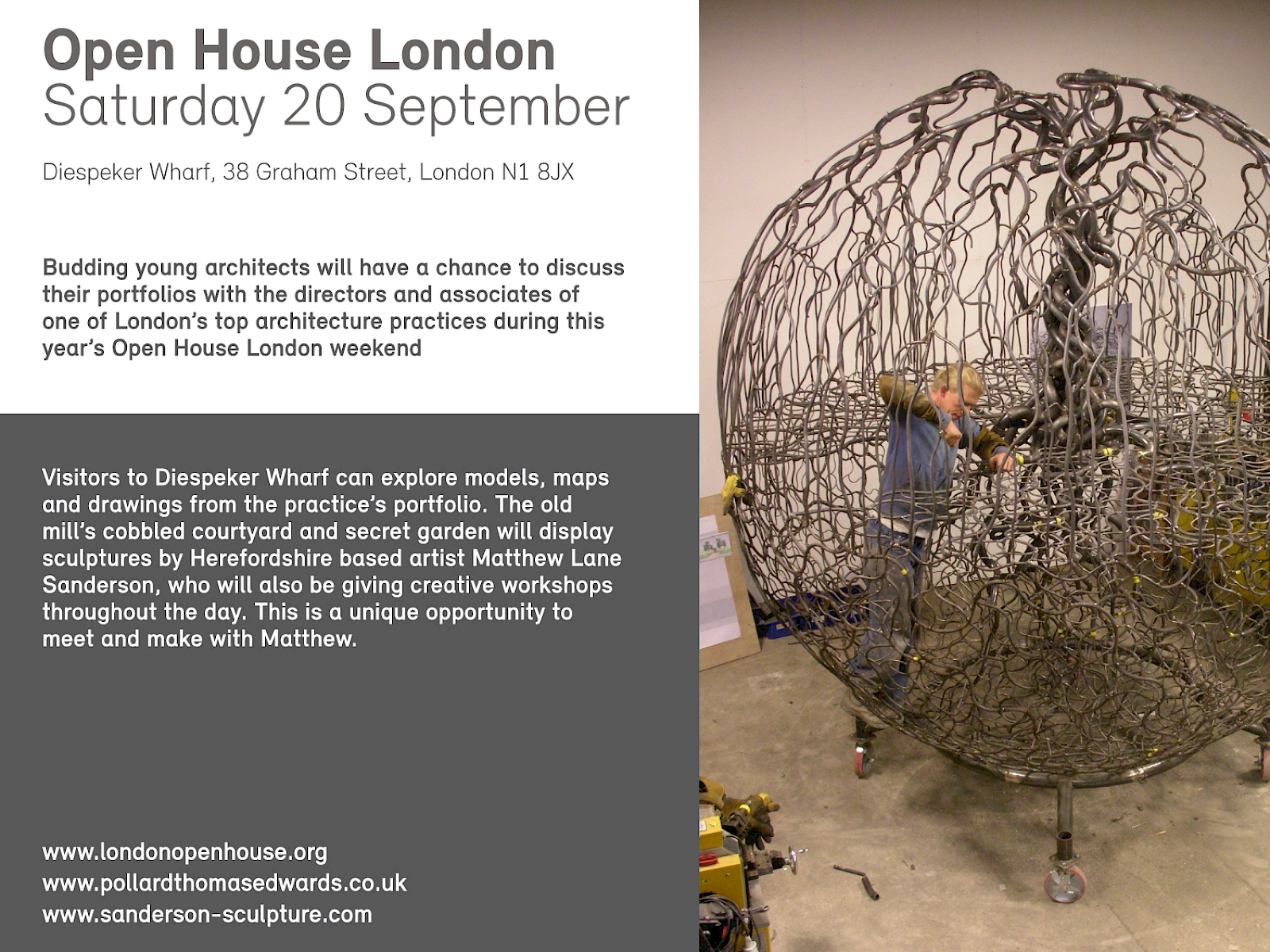 Budding young architects will have a chance to discuss their portfolios with the directors and associates of one of London’s top architecture practices during this year’s Open House London weekend. Islington architects Pollard Thomas Edwards have just celebrated four decades of creating new neighbourhoods and revitalising old ones. The practice’s canal-side studios at Diespeker Wharf will be open for tours on Saturday 20 September, as part of Open House London 2014. As well as the portfolio clinic for aspiring architects, PTE’s team will showcase their own artworks and an array of projects from across London and the southeast. PTE has been part of the solution to London’s housing crisis - in the past five years alone, they’ve designed over 7,000 new homes in and around the city. Many of their developments have mixed market and affordable housing in award-winning, ‘tenure-blind’ buildings. From its sensitively renovated heritage mill building, to clever mixed use schemes nearby, the company’s canal-side location is a living showcase of the practice’s diverse portfolio. When PTE bought the Victorian Diespeker Wharf in the mid-1990s, the City Road basin was still a neglected part of Islington. The renovation of the old brick mill, followed by two mixed apartment and office developments with partners Groveworld, kicked off the area’s regeneration. A new canal-side garden gave something back to the surrounding community, and a nearby school with housing above was a prototype for a new way of funding school development. PTE’s architects not only design award-winning developments, but also help many of their repeat clients find ways to fund affordable housing and make the most of limited city sites. Visitors to Diespeker Wharf can explore models, maps and drawings from the practice’s portfolio. The old mill’s cobbled courtyard and secret garden will display sculptures by Herefordshire based artist Matthew Lane Sanderson, who will also be giving creative workshops throughout the day. This is a unique opportunity to meet and make with Matthew. “In our 40 years of practice, we’ve pioneered ideas that are industry standard now. Talented people come to work for us from all over, but we’re always looking at growing the next generation of designers who can help shape our city.” Pollard Thomas Edwards - Executive Director, Andrew Beharrell Matthew Lane Sanderson Matthew is a sculptor who specialises in creating site-specific metalwork with natural and organic themes for public spaces. He will be showing groups and individuals how they can create their own piece of art, with a simple piece of wire. Using a technique he describes as ‘wire drawing’, in a drop in workshop throughout the day. A Herefordshire based artist, Matthew’s work has attracted a great deal of interest around the country and he has been commissioned for an exciting range of projects. Some of which are on show in his current exhibition at the practice, alongside a selection of new, never seen before work. So come along and have a look, and create your own masterpiece. www.sanderson-sculpture.com