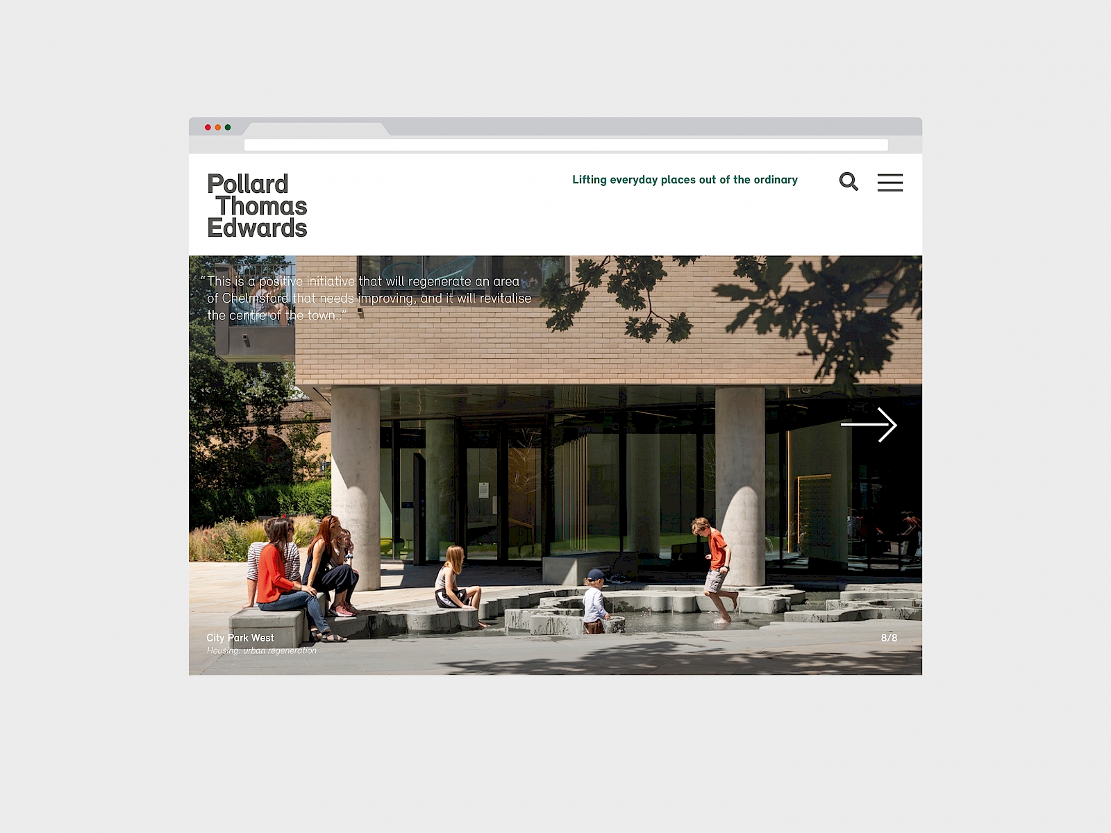 The website now publishes maxims, such as “Every 'unit' will be someone's home” and “Create more with less” at the top of the screen every time a page is refreshed or a new page is visited. “By presenting our brand statements online, we’re putting them centre stage, creating a dialogue between our company values and the buildings we design,” says partner Carl Vann. The effect is of a website designed to synchronise with and enhance PTE’s studio brand and inspire colleagues, clients and collaborators.