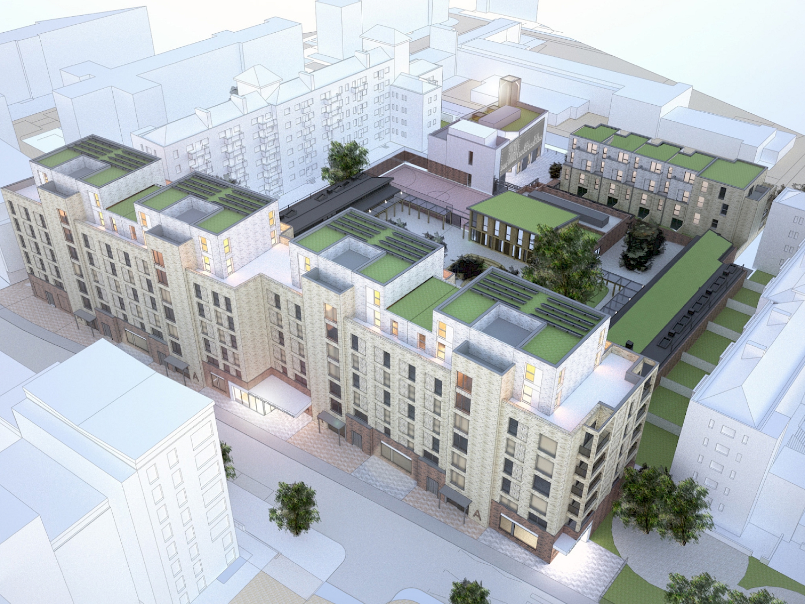 Pollard Thomas Edwards was originally commissioned by Poplar HARCA to carry out a feasibility study for a new primary school combined with mixed tenure homes on a site in Mile End, East London. The site is part of the Burdett and Leopold Estate and is currently occupied by two residential blocks, a community centre and a mosque. The scheme will create two forms of entry primary schools, a new Mosque, 109 mixed tenure homes, and children’s and public amenity space.