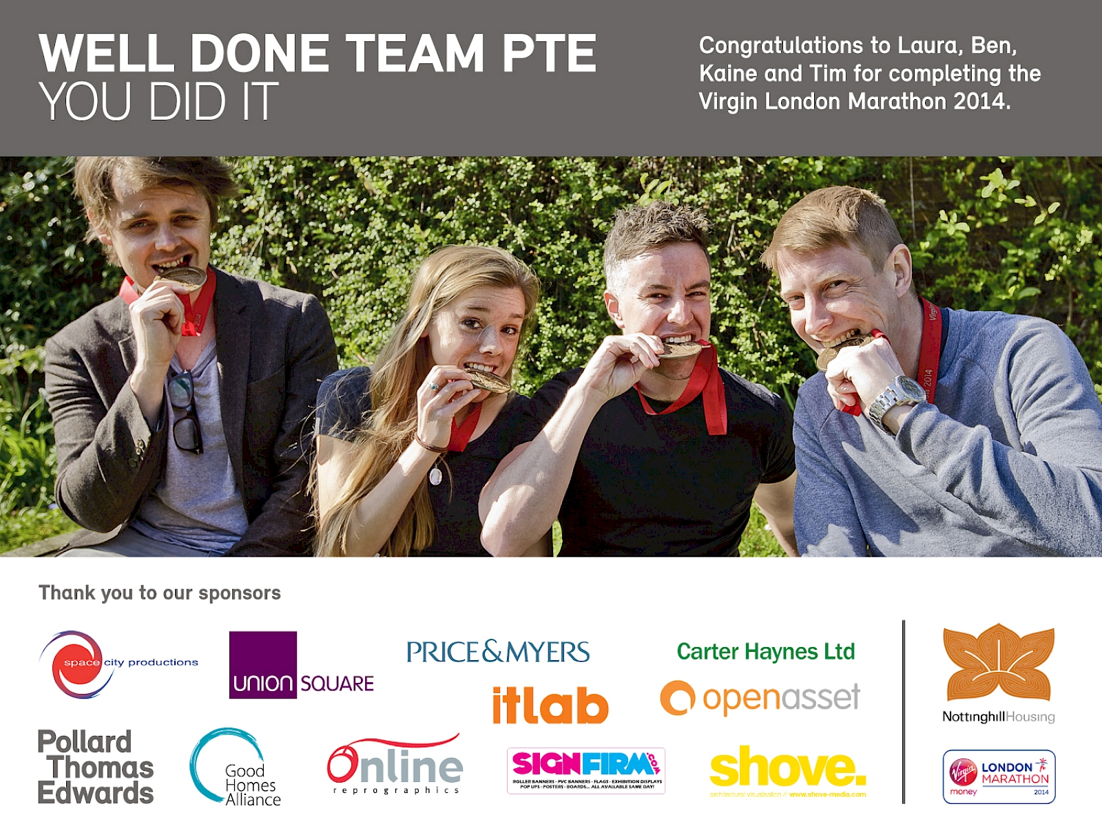 Congratulations to Laura, Ben, Kaine and Tim at PTE for completing the Virgin London Marathon 2014.