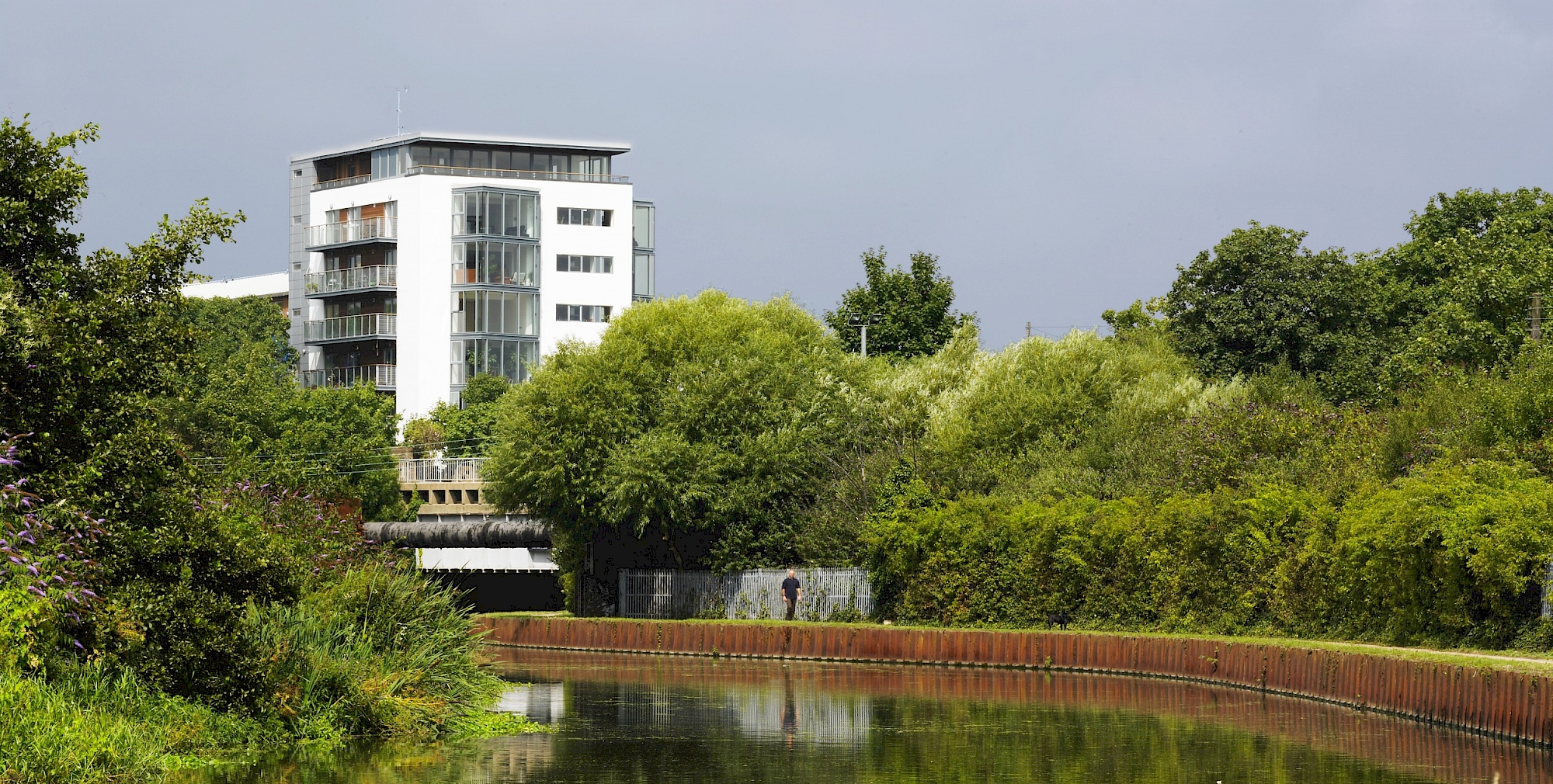 Our scheme has transformed this site into a development of 77 live/work units and commercial space set around a tranquil courtyard open to the Lea River basin with spectacular views over the water towards the Olympic site. The southern wing terminates in a nine-storey ‘full stop’ which overlooks the basin, with projecting glass bays taking advantage of views both up- and down-stream. The scheme also retains the old industrial forge building.