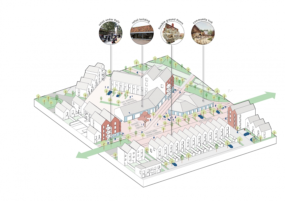 Taking inspiration from farm, barn and cottage typologies the character areas vary in density, from regular blocks arranged around green squares to homes facing onto a linear park, informed by the formal Georgian and early Victorian suburbs of Cambridge. Attractive green spaces and play areas provide safe routes to the local centre and proposed school.