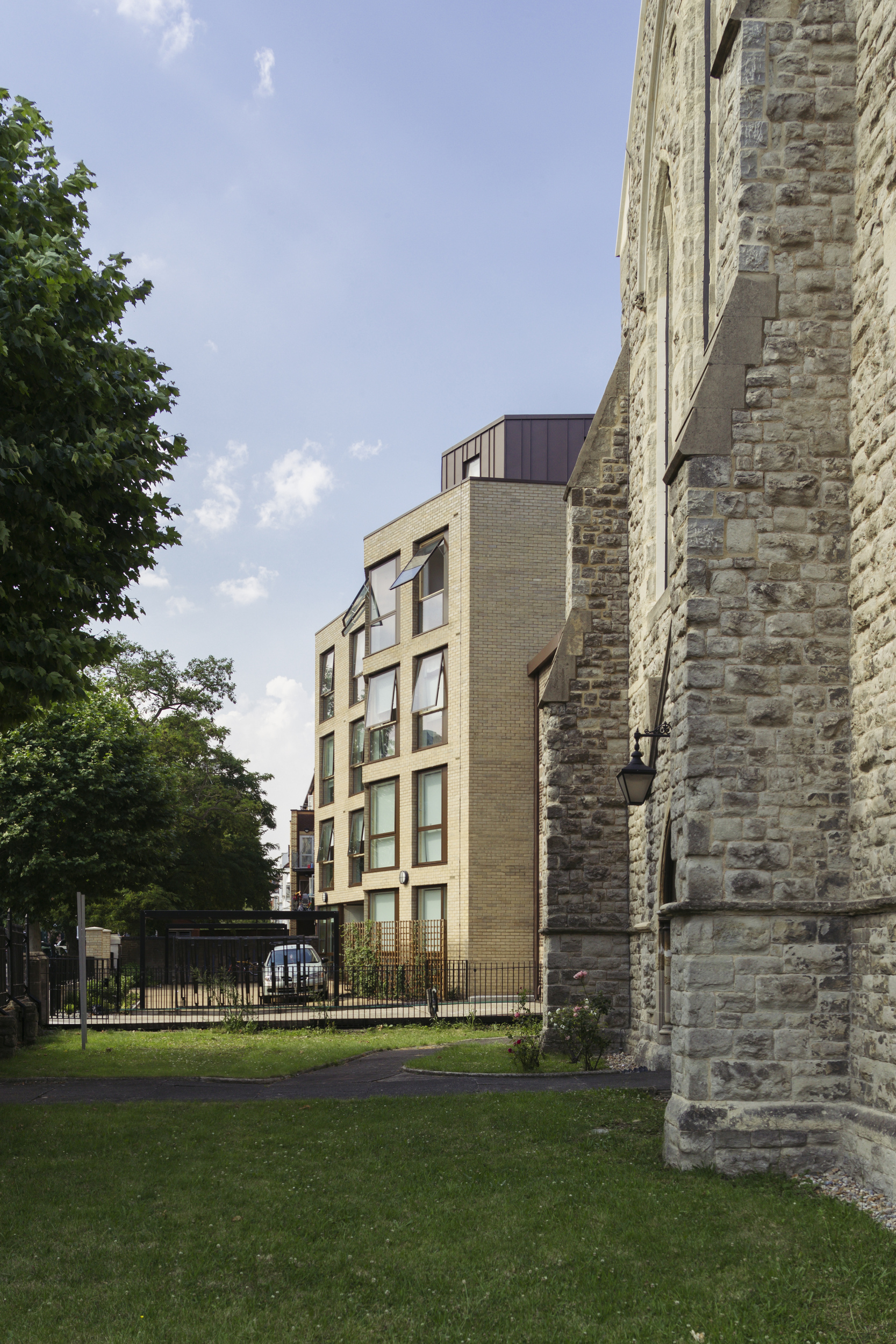 This scheme sees the demolition of two existing sheltered housing blocks adjacent to the Grade II* listed St Andrew’s Church, and the construction of two five-storey assisted care residential blocks for dementia sufferers. These two blocks will be linked by a single storey building providing communal facilities, and the new buildings wrap around a landscaped courtyard garden.